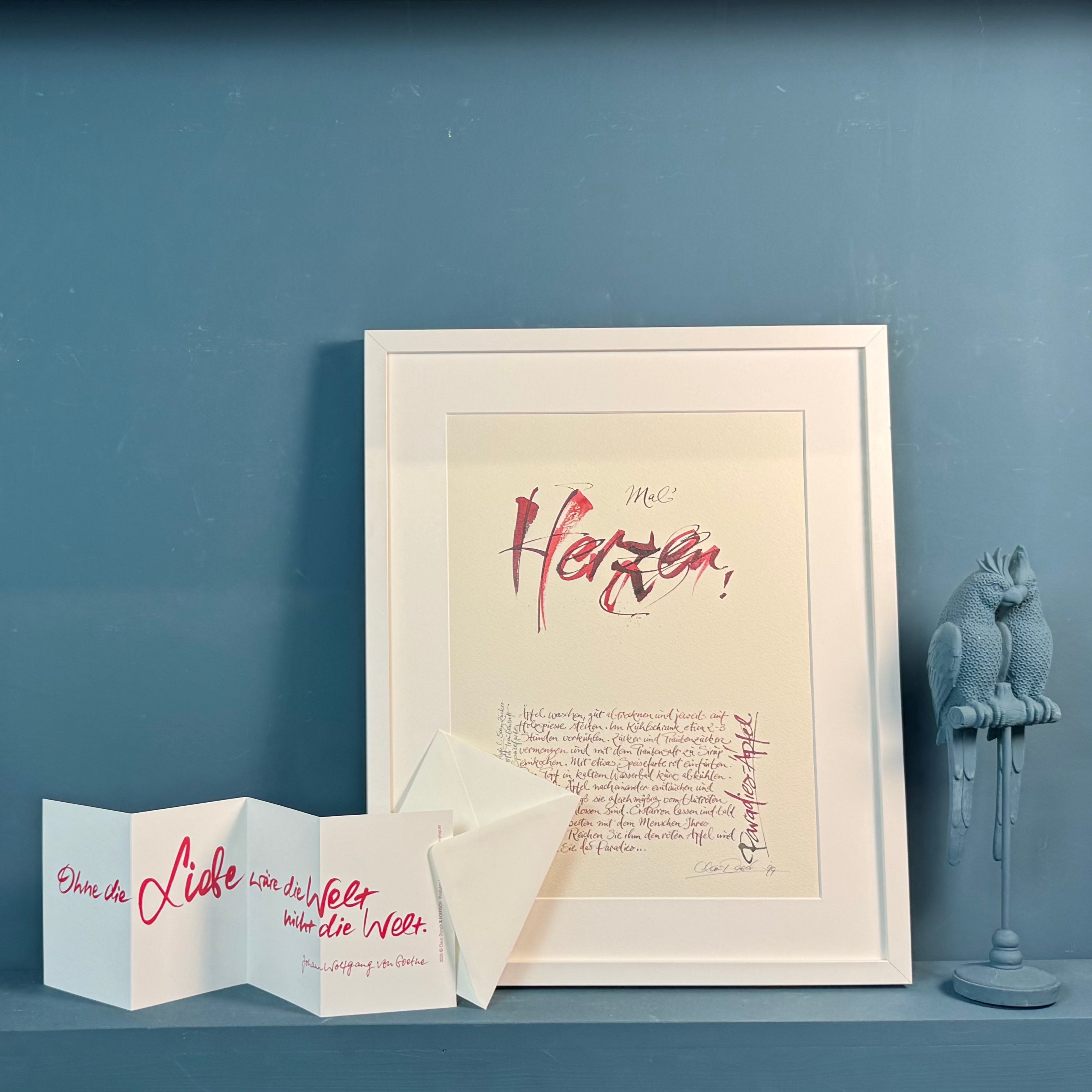 Ein kulinarisches Geschenk, das nicht nur den Gaumen, sondern auch die Seele erfreut. Moderne Kalligraphie Kunst mit liebevollen Mottos, die dazu inspirieren, das Leben mit Freude und Gelassenheit genießen. DIN A3 Kunstdruck, limitierte Auflage, nummeriert und handsigniert, Lieferung ohne Rahmen